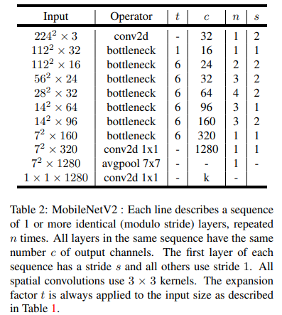 MobileNet V2의 전체 구조는 Table 와 같습니다. 첫 번째 layer 에서는 32 사이즈 필터의 convolution 을 수행하고 19개의 residual bottlenect 구조로 이루어집니다. 또한, 계산속도를 바르게 하기 위해 연산에 소요되는 bit 수를 줄인 low-precision 을 위해 ReLU6을 사용했고 expansion factor $t$는 6을 사용했다고 합니다.