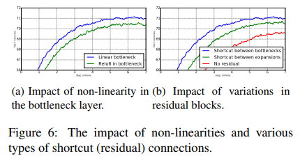 Figure 6(a) 는 linear bottleneck layer 에 ReLU 비선형함수를 적용/비적용했을 때의 성능 추이로 선형변환 자체는 비선형 변환에 비해 deep neural networks 표현력에 작은 부분을 미치지만 저차원에서 ReLU 를 적용했을 때에는 정보손실이 발생한다는 것을 볼 수 있습니다. Figure 6(b) 는 residual connection 의 적용 결과로 linear bottleneck layer 에 residual connection 을 적용한 것이 성능이 제일 좋은 것을 알 수 있습니다.