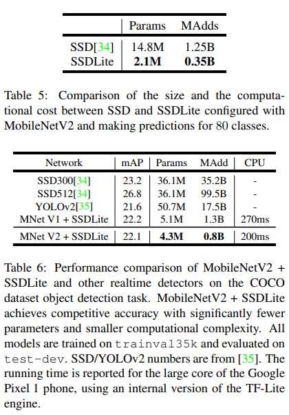 Object detection 에 사용되는 SSD 모델에서의 convolution 을 depth-wise separable convolution 을 치환한 SSDLite 에 MobileNet V1, 2를 각각 적용한 결과는 Table 5,6과 같으며 MobileNet V2 SSDLite 가 가장 정확하면서 파라미터 수, 연산량이 제일 적어 속도가 제일 빠른 것을 볼 수 있습니다.