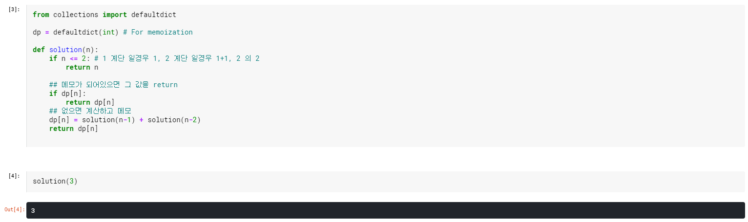 다이나믹 프로그래밍의 메모이제이션 코드와 거의 비슷합니다. return 조건의 경우 $n=1$이면 1가지 경우의 수, $n=2$이면 (1+1, 2)의 2가지 경우의 수가 존재하므로 $n$ 값을 return합니다.