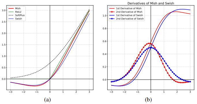 Mish 함수는 Swish 함수와 마찬가지로 1) 단조함수가 아니며, 2) 모든 구간에서 미분가능하고 (smooth), 3) 작은 음수의 값을 보존합니다. (Figure 3) 작은 음수의 값을 보존함으로써 Dying ReLU 값을 설계선에서부터 방지할 수 있습니다. 또한, ReLU 와 마찬가지로 unbounded above 이므로 값이 포화되지 않아 기울기가 사라지는 현상을 방지하고 bounded below 이므로 neural network 파라미터가 값이 급격하게 증가하지 않게 해주는 정규화 효과를 가지고 있습니다.