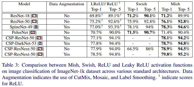 ImageNet 데이터셋에 대한 결과는 Table 3과 같습니다. Mish 함수는 기존에 쓰이던 Leaky ReLU / ReLU 함수에 비해 성능이 더 우수했으며, 간혹 Swish 함수가 성능이 더 높은 경우도 있지만 CSP-ResNext-50 경우에서 데이터 augmentation 을 사용하지 않았을 때 성능이 급격히 감소하는 현상을 보입니다. 이는 Swish 함수가 다양한 모델, 특히 모델이 깊어질수록 성능향상이 일관되지 않음을 나타냅니다.