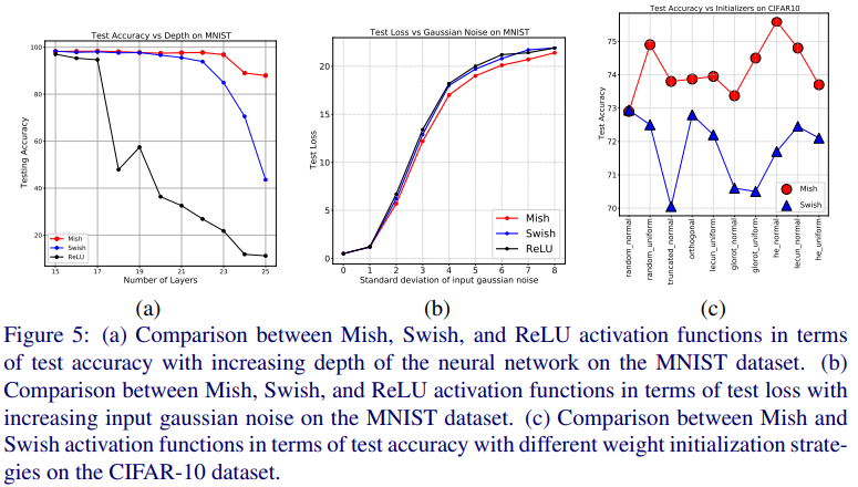 MNIST 데이터셋에 대한 Mish, Swish, ReLU 함수의 성능은 Figure 6과 같습니다. 먼저 Figure 6(a)에서 layer 수가 많아지면 ReLU 함수의 성능은 급격히 늦아지지만 Mish 함수는 성능 감소가 거의 없었으며 이는 smooth 함수인 Mish 특성 상 정보를 잘 전달하기 때문이라 추측됩니다. Figure 6(b)에서는 입력 데이터에 가우시안 노이즈를 첨가했을 때의 loss 그래프로 Mish 함수가 일관되게 낮은 loss 를 가짐을 확인할 수 있습니다. 마지막으로 Figure 6(c)는 neural networks 의 초기화 방법에 따른 성능 추이인데 Mish 함수가 Swish 함수에 비해 초기화 방법에 따라서도 일관되게 우수한 성능을 가짐을 알 수 있습니다.