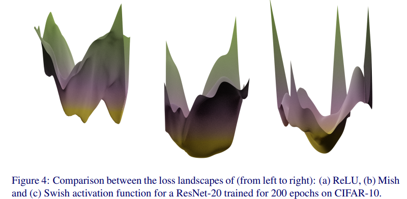 Figure 5와 같이 CIFAR-10 데이터셋에 200 epoch 만큼 훈련된 ResNet-20 networks 의 loss 분포를 각 활성화 함수 별로 분석해봤을 때, ReLU 함수는 loss 값이 높고 local minima 가 여기저기 산재해 있지만 Mish 함수는 다른 함수에 비해 loss 분포가 낮으면서도 굉장히 부드럽고 넓은 minima 를 가지고 있습니다.
