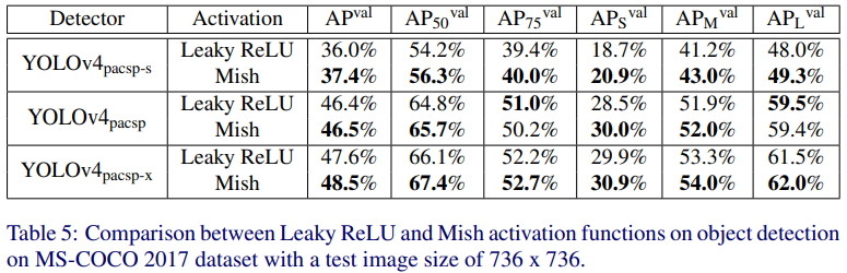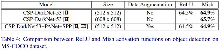 MS-COCO 데이터셋에 대한 object detection 성능은 Table 4와 같습니다. 성능 측정시 detection head 를 제외하고 CSP-DarkNet-53 backbone network 에 대해서 ReLU 함수를 Mish 함수로 대체하여 훈련합니다. 특히, YOLO v4 detector 에 대하여 Mish 함수를 사용함으로써 최소 0.9% 이상의 일관된 AP 향상을 얻을 수 있었다고 합니다. (Table 5)
