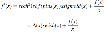 Mish 함수를 미분하면 Equation 1과 같이 Swish 함수 형태로 유도할 수 있습니다. $x\cdot sigmoid(x)$는 Swish 함수이며 $sech^2 (softplus(x))=\triangle (x)$ 입니다. 기울기값을 그대로 보존하는 ReLU 함수와 달리 Mish 함수는 $\triangle (x)$가 최적화 과정에서 기울기를 smooth 하게 만들어 수렴을 더욱 쉽게 해주는 preconditioner 로서 동작합니다.