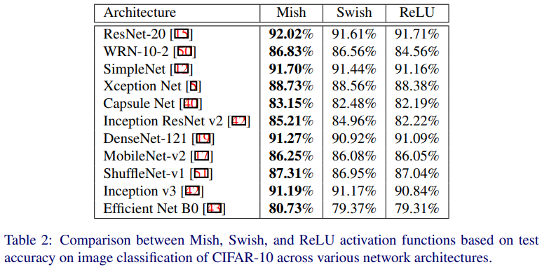 Table 2는 CIFAR-10 데이터셋에 대한 이미지 분류 성능 결과입니다. 하나의 구조가 아닌 다양한 CNN 계열 구조에 대해 실험했으며, Mish 함수가 다양한 구조에 대해서 다른 활성화 함수에 비해 일관되게 높은 성능을 가지고 있음을 알 수 있습니다.