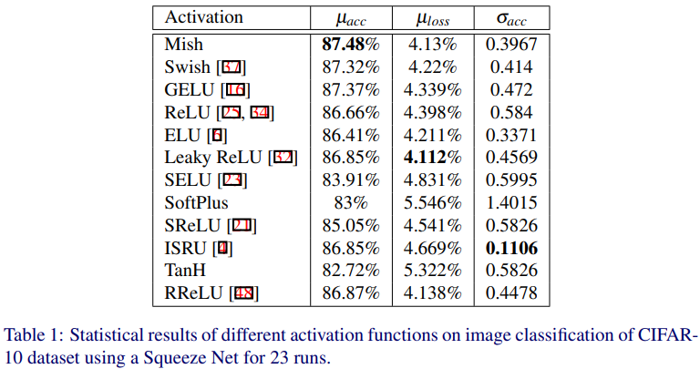 먼저, CIFAT-10 데이터셋에 대해 Squeeze Net 모델로 다양한 활성화 함수에 대해 여러번 성능을 측정하여 통계적인 유의성을 확보합니다. 단순히 몇번 돌려서 성능이 잘 나왔다기 보다는 통계적으로 유의마한 결과를 얻기 위해서죠. 활성화 함수만 바꾼채 최적화함수 (Adam), epoch 수 (50) 등을 일정히 유지한 채 23번 실험한 결과는 Table 1과 같습니다. 평균 정확도는 ($\mu_{acc}$) Mish 함수가 제일 높고 loss, 정확도의 편차는 Mish 함수가 매우 낮은 편에 속합니다.