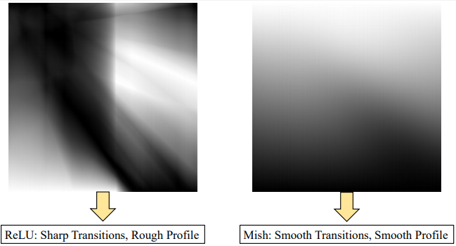 특히, Mish 함수는 ReLU 함수와 달리 모든 구간에서 연속이고 미분가능합니다. (continuosly differentiable) 이 특징은 기울기 기반으로 파라미터를 업데이트하는 최적화에서 기울기가 정의되지 않아 발생하는 불안정한 요소를 제거하여 neural networks 가 깊어지더라도 정보 손실을 최대한 방지하고 전 layer 로 전파하는 역할을 수행합니다. 이로서 깊은 neural networks 에 대해서도 안정적인 훈련과 높은 성능을 달성할 수 있습니다. Figure 4와 같이 랜덤하게 초기화된 5-layer neural networks 출력을 각 활성화 함수 별로 분석해봤을 때, ReLU 함수의 출력은 급격히 변하지만 Mish 함수의 출력은 굉장히 부드러운 분포를 가지고 있으며 이를 통해 최적화가 상대적으로 용이할 것임을 유추할 수 있습니다.