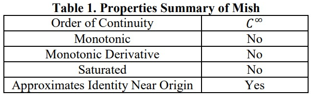 Mish 함수의 특징을 정리하면 Table 1과 같습니다. 정리하면 1) unbounded above 이므로 sigmoid, tanh 함수와 같이 값이 포화되었을때 기울기가 사라지지 않고, 2) 모든 구간에서 미분가능한 smooth 함수이므로 최적화 측면에서 유리하며 파라미터 초기화나 learning rate 에 덜 민감하고, 3) bounded below 이므로 정규화 효과를 가지면서 단조함수가 아닌 특성상 작은 음수부분에 대한 값을 유지하므로 ReLU 함수와 달리 기울기가 없어져버리는 현상을 방지합니다.