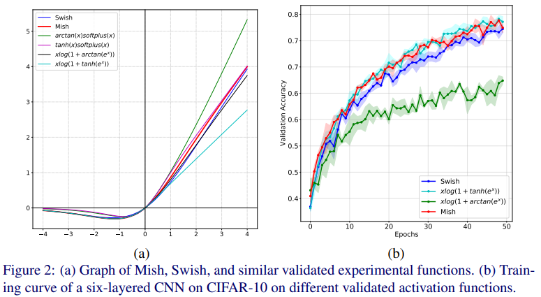 Mish 함수는 Swish 함수를 연장하여 $f(x)=x\cdot tanh(softplus(x))$ 형태를 정의합니다. ($softplus(x) = ln (1+e^{x})$) Swish, Mish 함수와 같이 자기자신 $x$에 비선형 함수를 거친 값을 곱한 것을 self-gating 이라 하는데 이는 LSTM 에서의 gating 모델링에서 유래된 것입니다. 이렇게 자기자신으로부터 스스로 gating 을 수행하니 다른 활성화함수와 마찬가지로 pointwise 함수로 사용될 수 있어 쉽게 치환이 가능합니다. Mish, Swish 형태의 활성화함수는 Figure 2와 같이 다양하게 정의할 수 있지만 CIFAR-10 데이터셋에 대한 간단한 실험시 Mish 함수가 제일 안정적이고 성능이 제일 높습니다.
