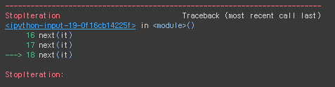 제너레이터 사용 시 주의할 점은 이터레이터가 모든 원소를 소진하게 되면 재사용이 불가능하다는 점입니다. next 내장 함수로 모든 원소를 호출하면 다음과 같에 StopIteration 에러가 발생합니다. 제너레이터를 재사용하기 위해서는 제너레이터로부터 새로운 이터레이터를 다시 정의해주어야 합니다.