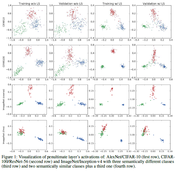 Figure 1의 마지막 줄은 Inception-v4/ImageNet 에 대한 결과로서 3개 중에 2개를 매우 비슷한 클래스로 선택한 경우입니다. ('toy poodle" / "miniature poodle") Hard 라벨에 대해서는 비슷한 클래스에 속한 샘플에 대해서는 거의 구분되지 않고 섞이는 것을 볼 수 있지만 label smoothing 적용 시 다른 클래스에 대해 같은 거리를 유지하기 위해 아크 형태를 보이게 됩니다. 결과적으로 hard 라벨을 통한 학습은 정답 클래스의 logit 만 매우 크게하고 정답이 아닌 클래스 logit 에 대해서는 강제하는 효과가 없지만 soft 라벨은 다른 클래스에 대해서 작지만 같은 확률을 부여하기 때문에 정답이 아닌 클래스들과 비슷한 거리를 유지하도록 강제하는 효과가 있습니다.