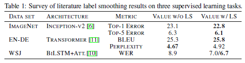 Multi-class 분류를 위한 cross entropy loss 에서 목적함수의 타겟으로 사용되는 라벨은 일반적으로 정확히 하나의 클래스만 명확히 표현하는 (one-hot vector) hard 라벨이 사용됩니다. Label smoothing 기법은 한 클래스가 전체를 모두 차지하는 hard 라벨을 정답 클래스의 비중을 약간 줄이고 나머지 클래스의 비중을 늘리는 soft 라벨로 변환하는 기법인데요, 처음에는 Inception 구조의 성능을 높이고자 도입되었고 간단한 정규화 방법으로 image classification, speech recognition, machine translation 분야에 Table 1에서 처럼 적극적으로 사용되고 있습니다.