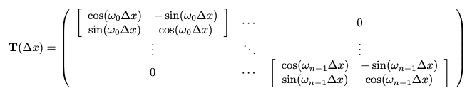 Equation 1과 같이 각 위치 별 positoinal encoding 벡터가 쌓인 $PE$ 행렬이 구성되고 다음 $v^i$에 대해 인덱스 벡터간 선형변환을 위해서 $PE(x+\nabla x) = PE(x)\cdot T(\nabla x)$를 만족하는 선형변환 $T$를 구성해야만 합니다.