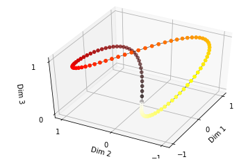 $x_i$는 시퀀스의 위치 인덱스이고 $j$는 임베딩 차원으로 $d_{model}$까지의 값을 가집니다. ($w_j$는 $j$에 해당하는 주파수를 나타냅니다.) 하지만 문제가 두가지 있습니다. 첫번째 문제는 Figure 5처럼 위 식을 따라 주기가 $\pi/2, \pi/4, \pi/8$에 대한 위치에 따른 3차원 encoding 결과를 나타낸 것으로 시퀀스 인덱스가 계속 움직이면 다시 처음 인덱스로 돌아가는 닫힌 구조로 되어 있습니다. 즉, 처음 인덱스와 멀리 떨어진 인덱스가 동일해진다는 것이죠.