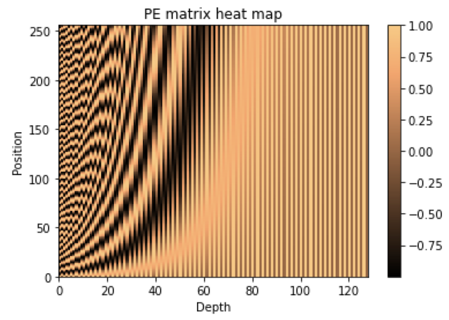 - $PE$ 행렬은 행은 sine / cosine 함수가 번갈아가면서 구성되며 열은 임베딩 차원이 커지면서 주파수가 감소합니다. (파장은 주파수의 역수이므로 증가합니다.)