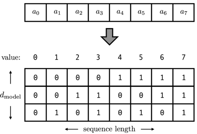 그렇다면 인덱스 값 자체를 이진수로 표현하는 것은 어떨까요? 이진수는 0과 1로만 구성되니 크기 문제에서도 자유롭고 정규화를 시켜줄 필요도 없습니다. 대신에 인덱스 최대값을 표현할 수 있는 위치당 $d_{model}$ 차원이 필요하겟죠. 하지만 우리는 연속적인 벡터로부터 임의의 위치를 표현하는 값을 얻고 싶은데 이 방법은 순수히 discrete 합니다. 즉, 위치 별로 discrete 한 값을 얻는다 하더라도 그것을 연속적인 함수로부터 얻고 싶고 그래야 중간 위치의 interpolation 또한 쉽게 가능하겠죠. 결과적으로 이진 벡터를 어떤 연속적인 함수로부터의 discretization 결과로서 얻는 방법이 필요합니다.