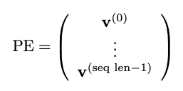먼저 각 $v^i$에 대해 sine 함수를 cosine 함수로 대체한 벡터를 구성합니다. 이후에 새로운 $PE$ 행렬을 sine 함수와 cosine 함수를 번갈아가면서 다음과 같이 구성합니다.