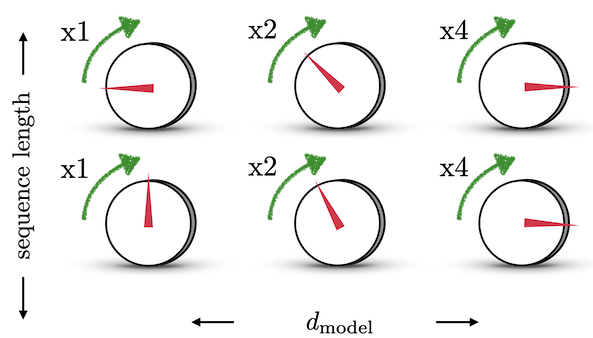 이를 수학적으로 어떻게 표현할 수 있을까요? 첫번째 dial ($d_{model}$의 첫번째 차원) 은 시퀀스를 한 스텝 움직일 때마다 0과 1이 바뀌니 주기가 $\pi/2$, 두번째 dial 은 $\pi/4$, 세번째 dial 은 $\pi/8$ 식으로 될 겁니다. 따라서 다음과 같은 형태로 쓸 수 있을 겁니다.