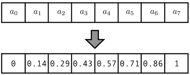 Positional encoding 이란 주어진 시퀀스에서 특정한 위치에 대한 유한한 차원의 representation 을 말합니다. 시퀀스 $A=[a_0, a_1, ..., a_{n-1}]$이 주어졌을 때 positional encoding 결과는 시퀀스의 각 원소의 위치와 원소 간의 위치에 대한 정보를 담고있는 텐서가 될 것이고 Transformer 에서는 입력 시퀀스의 각 원소별 임베딩 결과와 positional encoding 결과가 더해져야하므로 positional encoding 결과는 [시퀀스 길이, 임베딩 차원] 크기를 가져야만 합니다. 특히, 이상적인 positional encoding 을 위해서는 1) 각 위치 별로 유일한 벡터 값이고, 2) 서로 다른 길이의 시퀀스에 대해서도 적용이 가능하고, 3) 서로 다른 길이의 시퀀스의 두 인덱스 간 거리는 일정해야합니다. 그렇다면 가장 간단하게 위치를 담고있는 방법부터 생각해보겠습니다.
