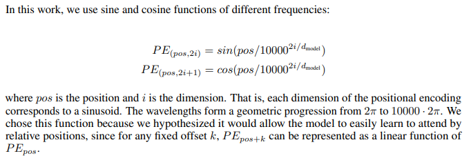 - 그렇다면 입력 시퀀스 정보를 담은 임베딩과 위치 정보를 담은 임베딩을 이어붙이지 (concatenate) 않고 더하는 이유에 대해서는 아직 명확히 정리된 것은 없음. 일단 더함으로서 메모리 공간 상으로 이득이 있고 최저 주파수가 1/10000 인 상태에서 상대적으로 시퀀스 길이가 짧을 경우 위치 임베딩이 매우 sparse 해질 것이고 이에따라 더하기를 하여도 입력 임베딩의 정보가 손실되지 않을 것이라고 추정됨.