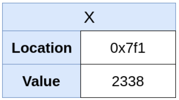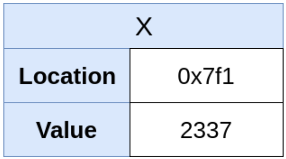 "int x = 2337" 같이 변수에 값을 할당하면 C에서는 1) 정수를 담기 위한 메모리 공간을 할당하고, 2) 할당된 공간에 값을 부여하고, 3) x로 하여금 그 값을 가리키게 합니다. 그림으로 Figure 1과 같이 표현할 수 있습니다.