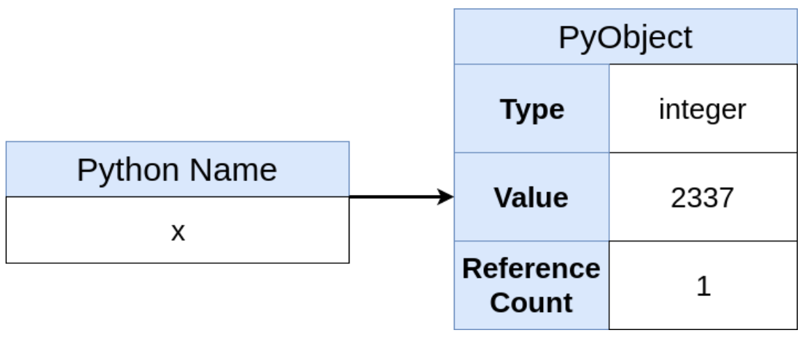 보통 편의상 변수라고 하지만 파이썬에서는 실제로는 객체에 부여된 이름에 불과합니다. 위와 마찬가지로 파이썬에서 "x = 2337" 이라하면 1) CPython 에서 사용되는 모든 파이썬 객체의 기본 C 구조체인 PyObject 생성하고, 2) PyObject의 typecode를 정수로 설정하고, 3) PyObject의 value를 2337로 설정하고, 4) x라는 이름을 생성하고 이것이 PyObject를 가리키게 하면서, 5) PyObject의 refcount를 1 증가시킵니다. 이를 그림으로 표현하면 Figure 4와 같습니다.