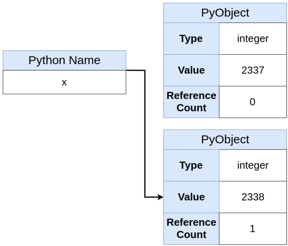 C에서와의 차이점은 x가 특정 메모리 공간을 점유하는 것이 아니라 새로 생성된 PyObject가 메모리 공간을 점유하고 x는 그것을 가리키는 이름인 것입니다. 즉, C에서처럼 변수 x가 특정 메모리 공간을 차지하지 않습니다. 이 상황에서 "x = 2338" 로 값을 수정하면 어떻게 될까요? 새로운 값 2338을 담은 PyObject를 생성하면서 x가 새로운 PyObject의 이름이 되면서 refcount가 예전 PyObject에서는 1 감소하고 새로운 PyObject에서 1 증가합니다. 즉, x가 메모리 공간을 점유하고 있지 않으니 엄밀히 말하면 할당 (assignment)가 아니게 됩니다. 추가적으로 기존의 PyObject의 refcount가 0이 되었으므로 garbage collector에 의해 삭제됩니다.