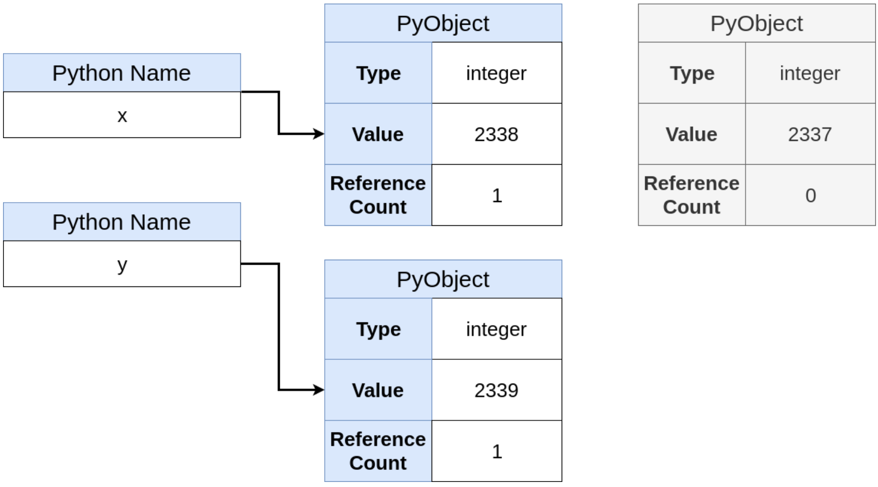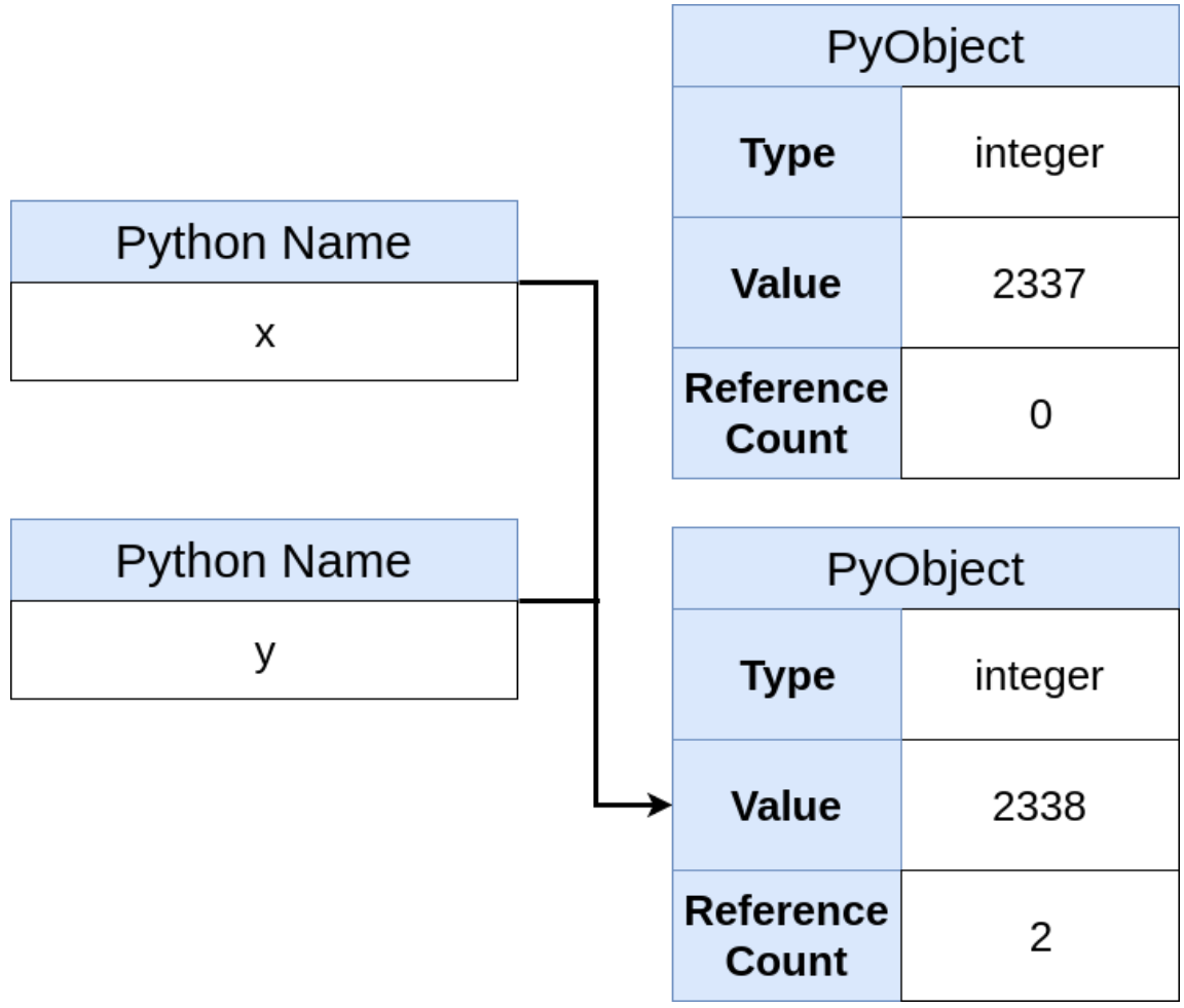 여기서 "y += 1"을 수행한다면 2339가 담긴 새로운 PyObject가 생성되므로 "y is x"가 False가 되며, refcount가 조정됩니다. 정리하면 파이썬에서의 할당 (=) 오퍼레이션은 변수에 할당하는 것이 아니라 객체에 레퍼런스할 이름을 부여하는 것이라 볼 수 있습니다.