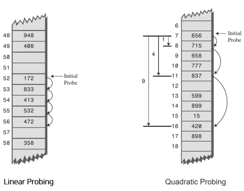 오픈 어드레싱은 충돌이 발생할 경우 탐색 (probing)을 하게 되는데, 현재의 해싱 인덱스로부터 고정폭만큼 이동하여 비어있는 버킷에 저장하는 Linear Probing 방식과 고정폭이 대신 폭을 제곱만큼 늘리는 (처음 충돌은 1칸, 두 번째 충돌은 4칸, 세 번째 충돌은 9칸...) Quadratic Probing 방식이 있습니다.