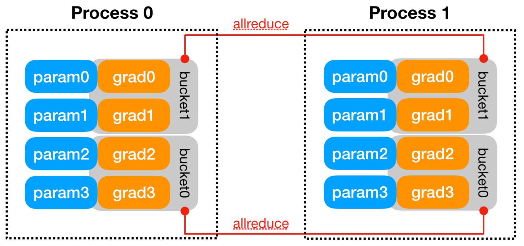 Pytorch DDP (torch.nn.parallel.DistributedDataParallel) 함수는 어떤 방식으로 동작할까요? 먼저 각 process 별로 torch.nn.Linear 함수를 이용한 간단한 선형모델을 한 번의 forward/backward pass를 거치는 간단한 예제를 살펴보겠습니다.
