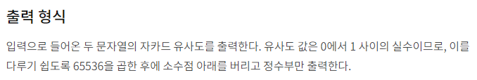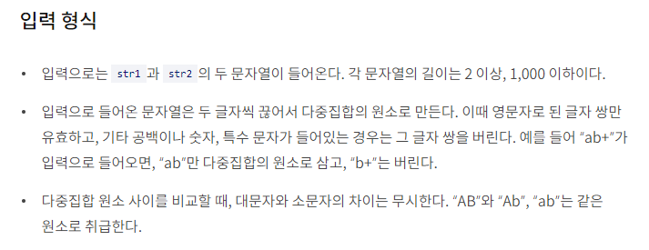 문제는 입력으로 들어오는 두 문자열에 대해 자카드 유사도 (Jaccard Similaraity)를 계산하는 문제입니다.