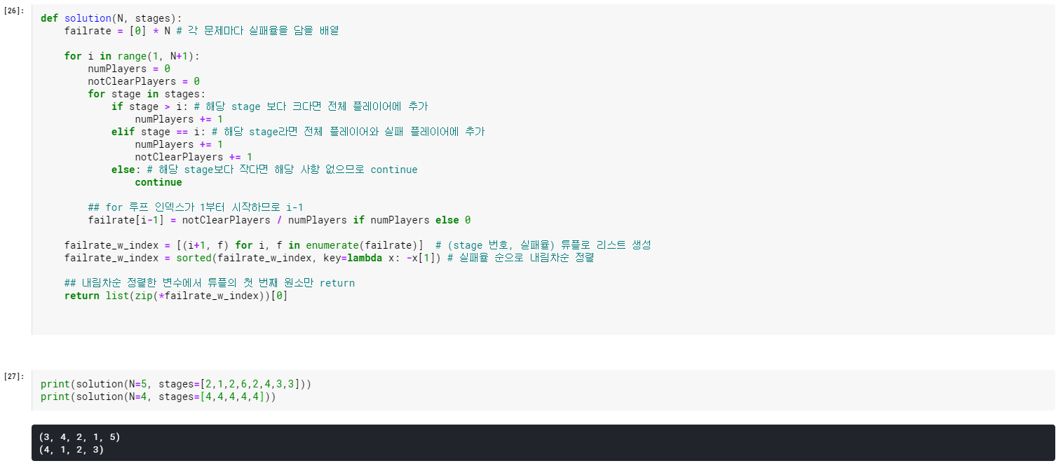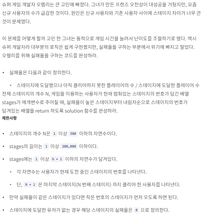 각 stage마다 실패율을 담은 배열을 작성한 뒤 정렬하면 간단하게 풀리는 문제입니다.