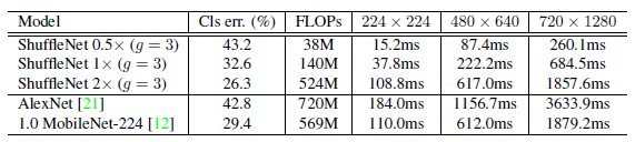 ShuffleNet 뒤에 0.5 x 나 0.25 x 는 기존 ShuffleNet 1 x 에서 파라미터의 개수를 0.5배, 0.25배 줄인 모델입니다. 따라서 FLOPS가 주는 대신 classification error가 올라간 것을 확인할 수 있습니다.