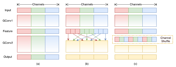 - (b), (c)를 보시면 1 x 1 convolution에 pointwise group convolution을 적용한 것을 알 수 있으며 첫 번째 pointwise group convolution 이후에 channel shuffle을 진행합니다.