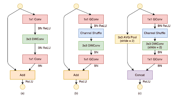 (a)는 기존 residual block이고 (b), (c)가 ShuffleNet 유닛입니다. (b)는 입력 사이즈가 유지되며, (c)는 입력 사이즈를 절반으로 줄일 때 사용됩니다. ShuffleNet은 (b), (c)의 유닛이 반복적으로 구성되어 이루어집니다.