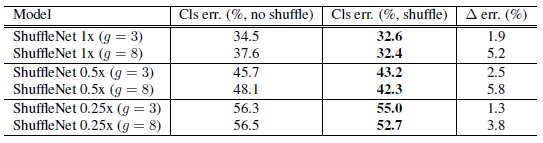 그룹의 개수에 상관없이 channel shuffle할 때 classification error가 더 낮아진 것을 확인할 수 있습니다. 특히, 그룹의 개수가 클 때 channel shuffle의 효과가 더 큼을 볼 수가 있습니다. Channel shuffle로 인한 그룹간 정보 교환이 효과 있음을 확인할 수 있네요.