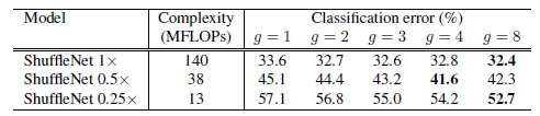 ShuffleNet 1 x 의 결과를 보시면 됩니다. 그룹의 개수가 8일 때 classification error가 제일 낮은 것을 확인할 수 있습니다. 이는 pointwise group convolution으로 제한된 연산량에서 더 큰 feature 개수를 사용 가능하여 표현력이 높아졌다고 해석할 수 있습니다.