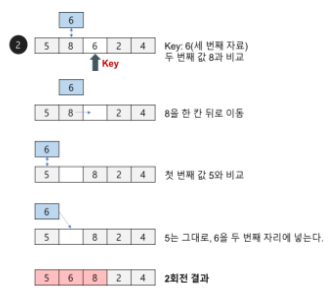 2. 두 번째 스텝입니다. 세 번째 인덱스인 6을 기준으로 앞서 첫 번째 스텝에서 정렬되었던 배열에 대해 비교를 시작합니다. 앞서 두 번째 인덱스로 옮겨졌던 8이 6보다 크므로 8과 6이 스왑되지만 5는 6보다 작으므로 6의 위치는 두 번째 인덱스가 됩니다.