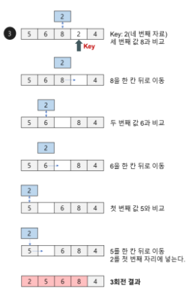3. 세 번째 스텝입니다. 네 번째 인덱스인 2를 기준으로 앞선 배열 [5,6,8] 과 비교를 시작합니다. 과정은 똑같습니다. 2가 왼쪽으로 옮겨가면서 자기보다 크면 스왑을 작으면 그 자리에서 멈춥니다. 결과적으로 이번 스텝에서는 2가 5,6,8 보다 작으니 맨 앞에 위치하게 됩니다.