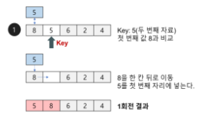 삽입 정렬은 배열의 모든 요소를 앞에서부터 차례대로 이미 정렬된 원소들과 비교하여 자신의 위치를 찾아가는 정렬방법입니다. for 문을 통해 배열의 원소를 순회하면서 해당 인덱스의 원소가 찾아갈 위치를 앞부분의 어디에 삽입할 것인가를 찾는 알고리즘인데요, 특이하게도 삽입 정렬은 배열의 두 번째 인덱스부터 루프를 시작합니다. 배열 [8,5,6,2,4] 예를 들어 살펴볼까요?