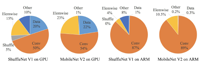 GPU, ARM 등의 플랫폼마다 같은 FLOPS라 하더라도 실행 시간이 다릅니다. 예를 들어 행렬 곱연산을 하기 위한 tensor decomposition 기술은 FLOPS는 75% 줄이더라도 GPU에서는 오히려 더 느려집니다. 밑의 그림에서 볼 수 있듯이 같은 연산이라 하더라도 플랫폼마다 실행 시간에서 차지하는 비중이 달라집니다.