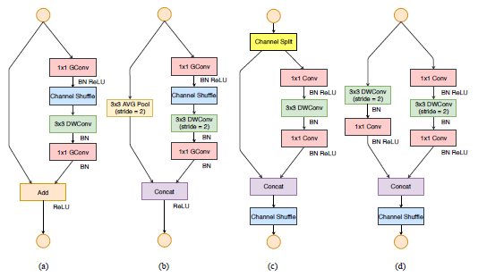(a), (b)는 기존 ShuffleNet 유닛, (c), (d)는 ShuffleNet V2 유닛입니다. (b)와 (d)는 입력 사이즈를 절반으로 줄일 때 사용되는 유닛이며 DWConv 는 depthwise convolution, GConv는 group convolution입니다. ShuffleNet V2의 차이점을 뭘까요?
