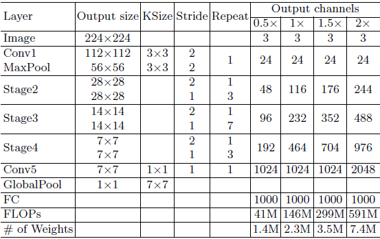 위의 표는 각 FLOPS 범위마다 다른 경량화 모델과의 속도를 비교한 것입니다. 표를 보면 주어진 FLOPS에서 ShuffleNet V2가 다른 모델보다 큰 차이로 속도가 앞선 것을 볼 수 있는데, 이는 가이드라인을 준수한 효율적인 설계 덕분이라 생각됩니다.