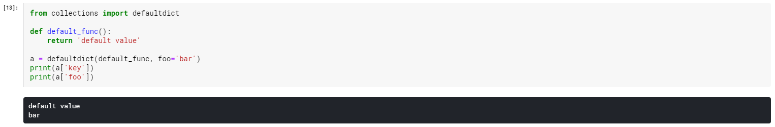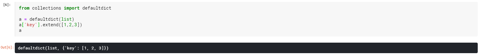 - 딕셔너리와 거의 같다. 키가 없는 경우에도 KeyError를 raise하지 않고 디폴트로 세팅된 초기값을 return함