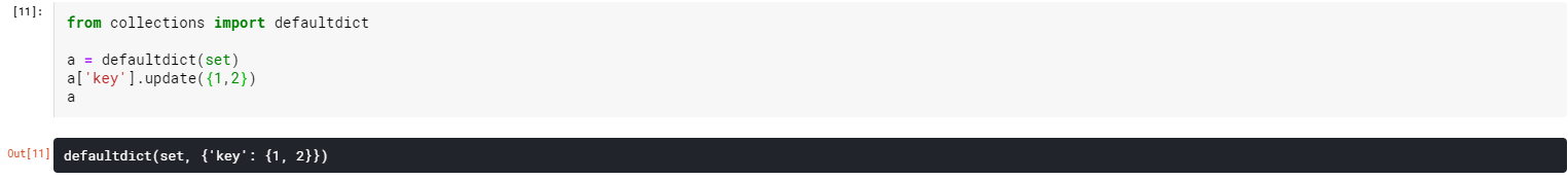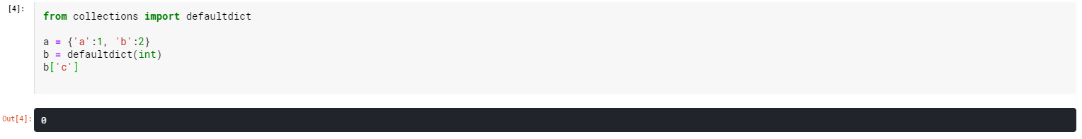 이 초기값의 경우 defaultdict를 어떻게 설정하느냐에 따라 달라집니다. int의 경우 0, list의 경우 빈 리스트가 존재하지 않는 키 값에 대해 자동으로 세팅됩니다.