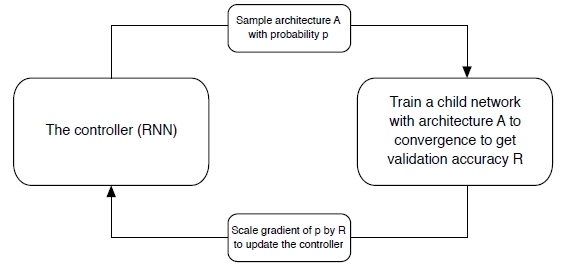 강화학습으로 최적의 architecture를 찾는 연구는 2017년에 발표된 "Neural Architecture Search with Reinforcement Learning" 논문으로 각 convolution layer의 stride, filter size등을 결정하는 RNN controller와 이 RNN controller로 구성한 모델을 학습시킨 후, validation accuracy를 reward로 하여 RNN controller를 학습시키는 방향으로 이루어져 있습니다.