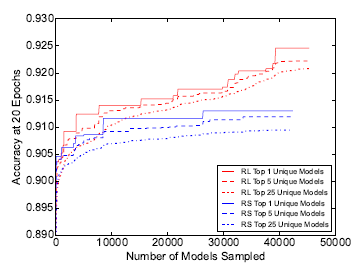 이 실험은 강화학습과 random search로 search space를 탐색했을 때의 효율성을 비교하는 것입니다. 즉 무작위로 최적의 모델을 찾았을 때보다 강화학습이 얼마나 효과적인지를 알고 싶은 것입니다. 여기서의 random search는 RNN controller의 softmax 단의 확률로 구성 요소를 뽑는 것이 아닌 uniform distribution에서 구성 요소를 뽑는 것을 말합니다.