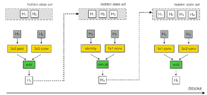 Convolution cell은 NASNet의 기본 구성 요소입니다. 다음 그림과 같이 여러 개의 block을 쌓아 하나의 cell을 구성합니다. 주목할 점은 매 block의 결과물이 새로운 hidden state로 추가된다는 점입니다.